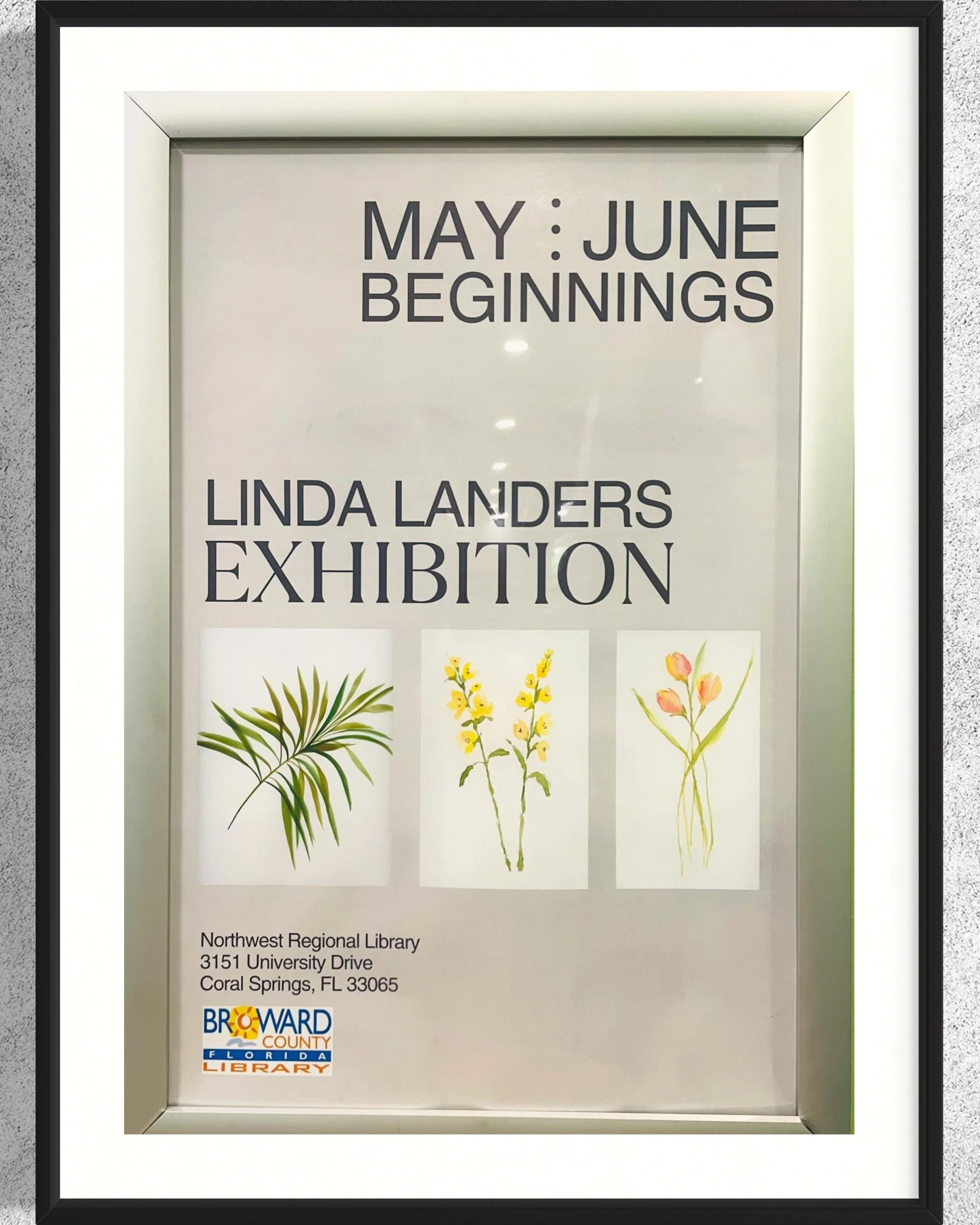 May and June 2025 for “Beginnings” in collaboration with Art Around Town and Broward Art Guild, at NW Regional Library, Coral Springs, Florida